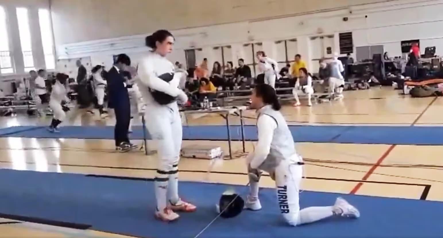 Turner se arrodilló frente a su oponente, Redmond Sullivan, porque considera que enfrente tiene a un “hombre” y eleva la notoriedad de un torneo universitario menor de esgrima de la Universidad de Maryland a escala mundial. Los jueces aplican la normativa de USA Fencing, la federación estadounidense de esgrima, y la descalifican porque no hay excusas para negarse a competir ante otro oponente, mientras defiende su directiva transgénero y no binaria de 2023, que busca la compleja conciliación entre inclusión y la integridad de la competición.